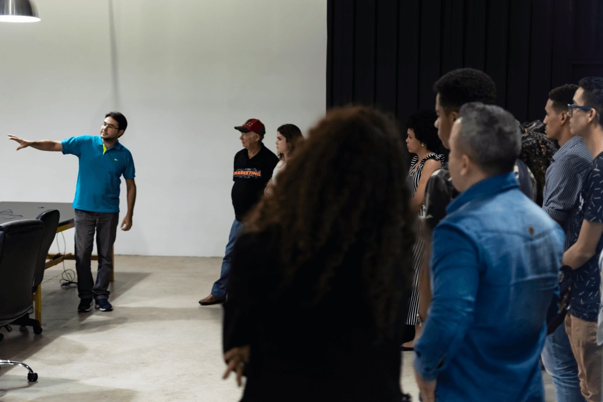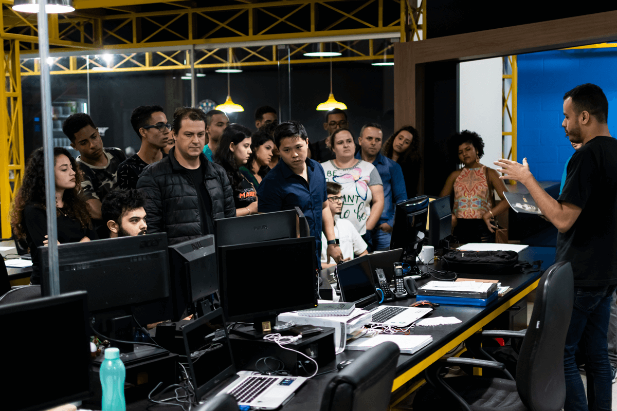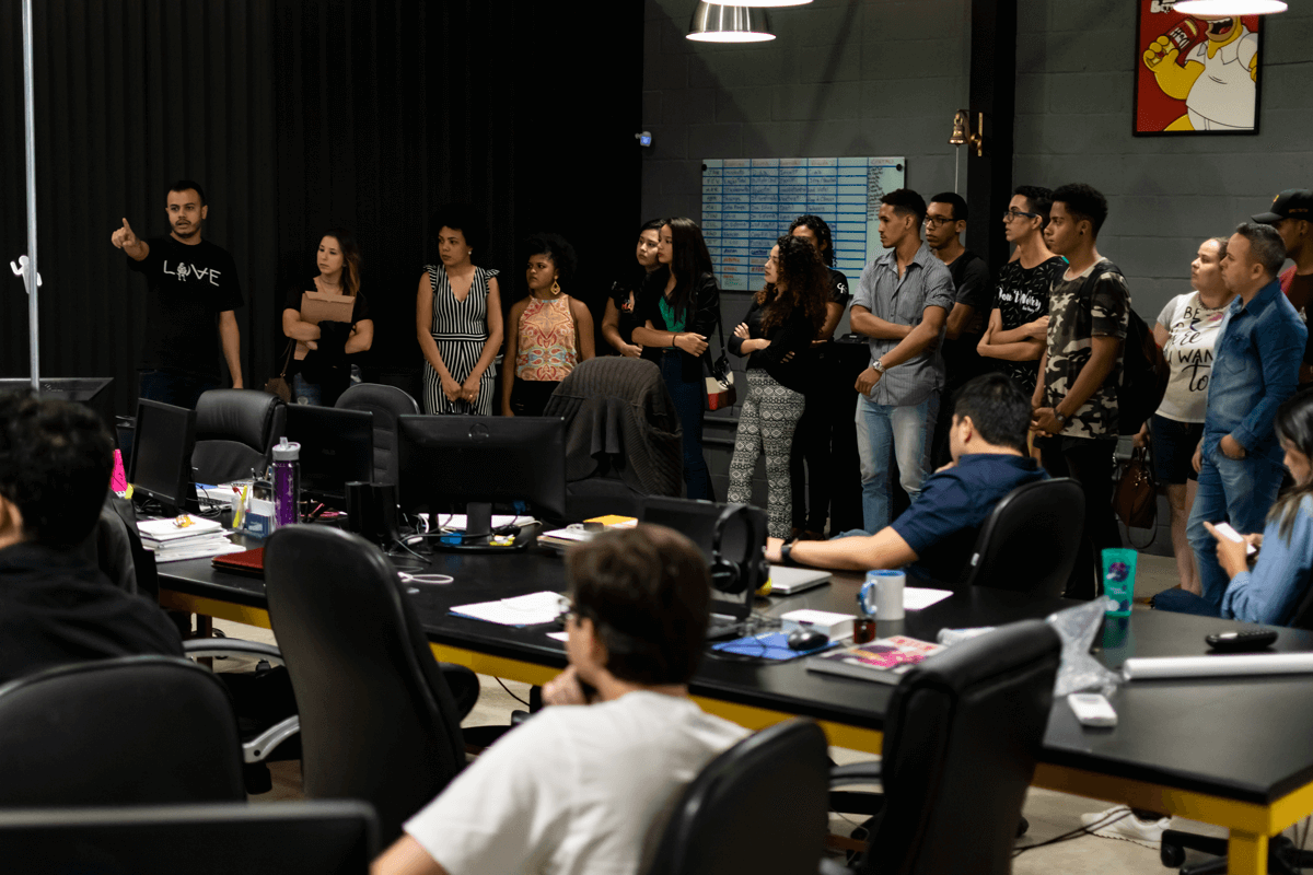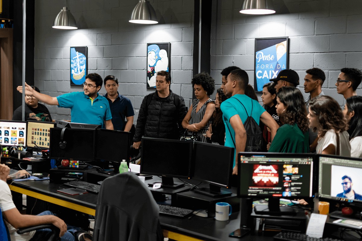 Numa roda de bate-papos descontraída, com parte da equipe da agência, os estudantes puderam esclarecer suas dúvidas e entender o funcionamento de cada departamento, a relevância do diálogo entre as funções para o desenvolvimento de trabalhos bem feitos, as constantes atualizações do mercado digital e suas exigências, a importância do planejamento antecipado, entre outros aspectos.